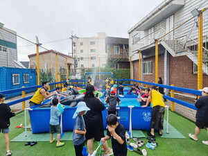 중소기업사랑나눔재단은 지난달 19일, 인천시 부평구에 위치한 아동보육시설 ‘파인트리홈’을 찾아 아이들을 위한 물놀이터 조성과 간식 지원 봉사활동을 진행했다고 밝혔다.이번 봉사활동에는 중소기업연합봉사단 소속 자원봉사자 20여명이 참여했으며, 본격적인 무더위를 맞아 보육원 아이들이 시원하게 뛰어놀 장소를 선물하고자 야외 수영장 설치와 다양한 물놀이 프로그램을 준비했다.봉사자들은 행사 전부터 수영장 조립, 튜브 준비, 물풍선 만들기 등 물놀이 공간 조성을 위한 작업에 힘을 모았으며, 아이들의 안전을 위한 현장 점검도 함께 이뤄졌다.이날