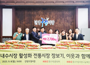 중소기업계가 충북 단양 전통시장을 찾아 나눔과 소비 활성화에 함께 나섰다. 중소기업사랑나눔재단은 8일 단양구경시장에서 1000만원 상당의 쌀 2700㎏을 구입해 단양노인복지관, 단양장애인복지관, 다래동산, 충북장애인부모연대 단양군지회 등 4개 복지시설에 전달했다. 이날 행사에는 한병준 중기중앙회 부회장과 지역 복지시설 대표, 안명환 단양구경시장 상인회장이 함께했다.한병준 부회장은 “민생경제의 표본인 전통시장에서 물품을 구매해 지역 소비 활력을 도모하고, 이를 다시 그 지역 복지시설에 전달하며 따뜻한 온정을 함께 나눴다”라며, “내수