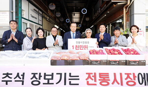 중소기업사랑나눔재단은 지난 23일 제주 서귀포시 모슬포중앙시장에서 장보기 행사를 열고 총 1000만원 상당의 기부금품을 지역 복지시설에 전달했다고 밝혔다.이번 행사는 추석 명절을 앞두고 전통시장을 활성화하고 지역경제에 활력을 불어넣기 위해 마련된 것으로, 재단은 현장에서 직접 물품을 구매하며 지역 상인들과 호흡을 같이했다.이날 행사에는 손인국 사랑나눔재단 이사장을 비롯해 한영돈 재단 이사, 성상훈 중소기업중앙회 제주중소기업회장이 함께했으며, 복지시설 대표로 이주일 서귀포오름지역자활센터장과 김대주 제주장애인지원협의회 대정지회장이 자리