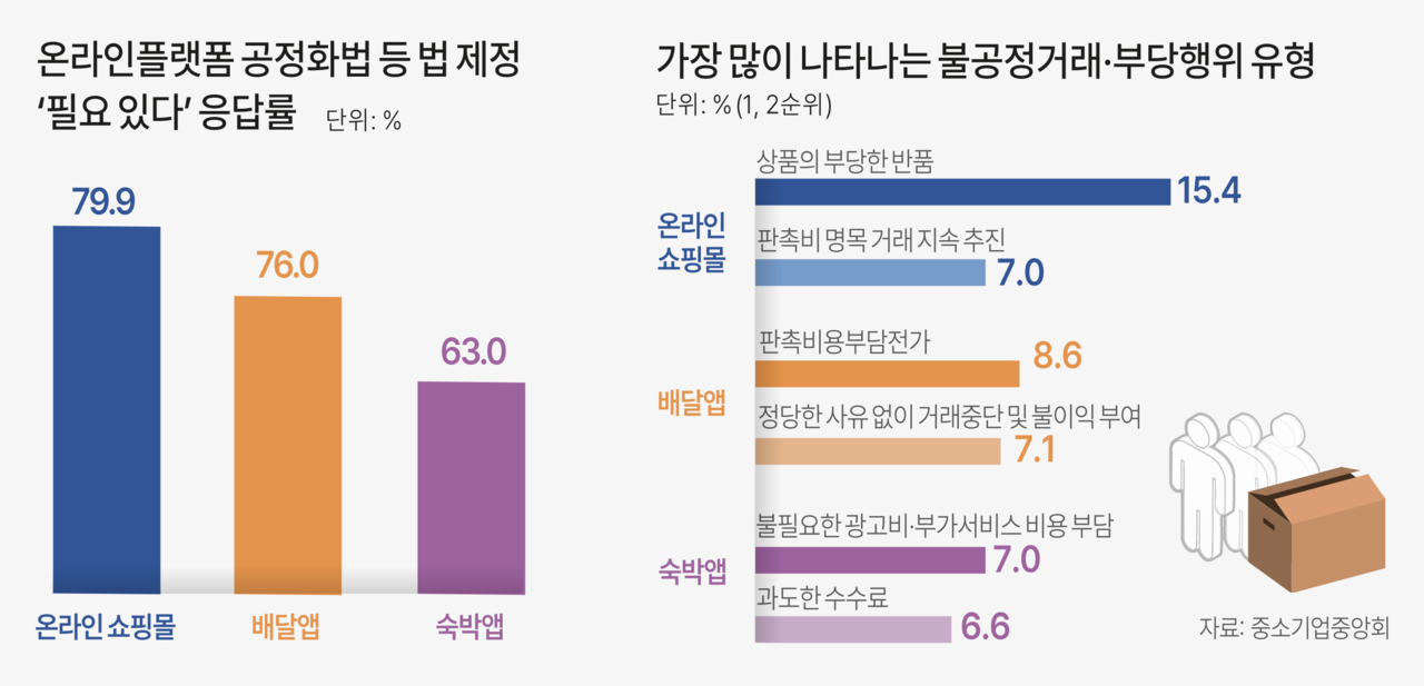 중소기업중앙회는 온라인쇼핑몰, 배달앱, 숙박앱 등 주요 온라인 플랫폼에 입점한 중소기업 1240개사를 대상으로 실시한 ‘2025년 온라인 플랫폼 입점업체 거래 실태조사’ 결과를 지난 29일 발표했다.