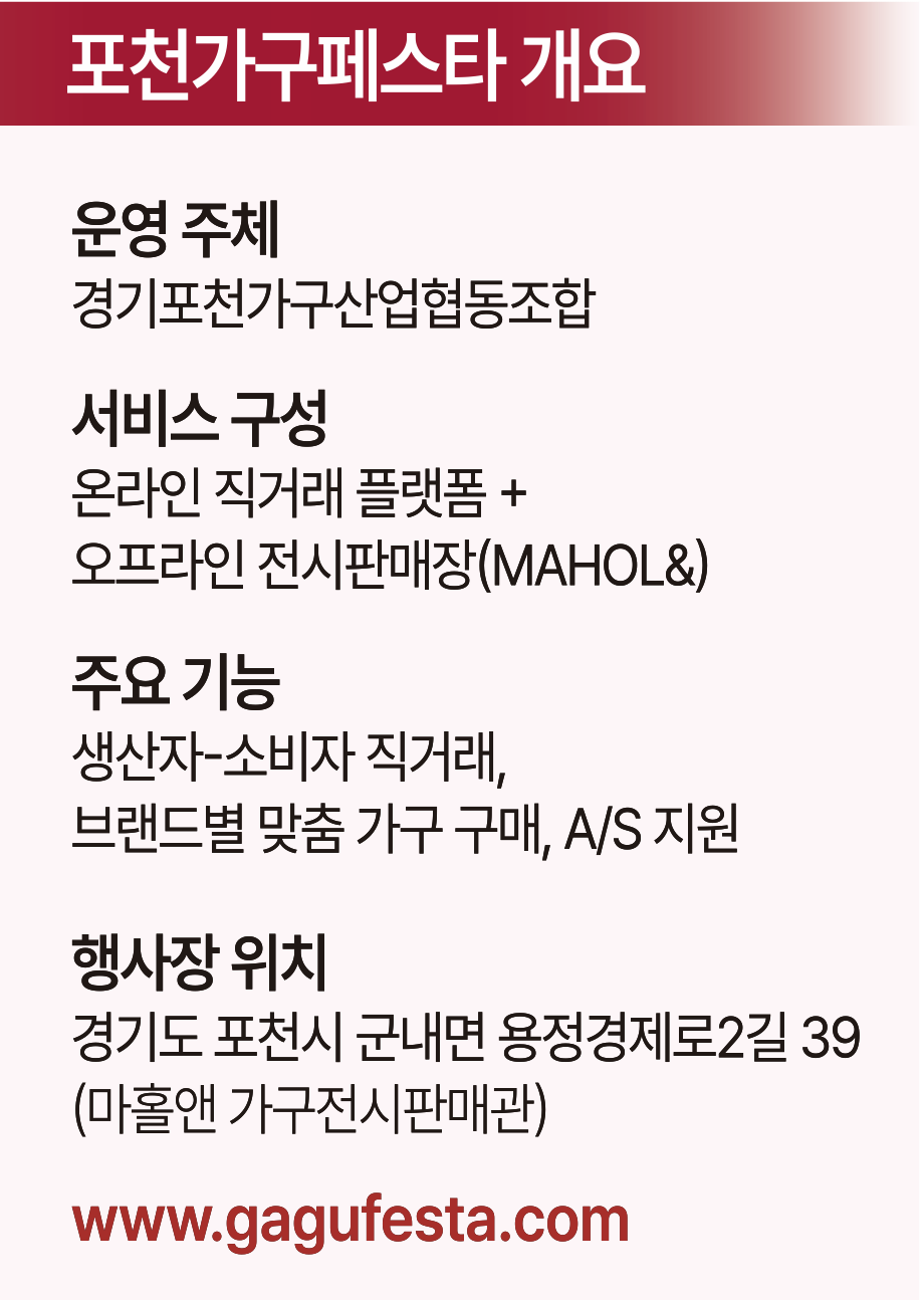 경기포천가구산업협동조합(이사장 임계종)은 복잡한 가구 유통구조를 혁신하고, 생산자와 소비자가 직접 거래할 수 있는 새로운 유통 플랫폼 ‘포천가구페스타’를 구축·운영하며 주목받고 있다.
