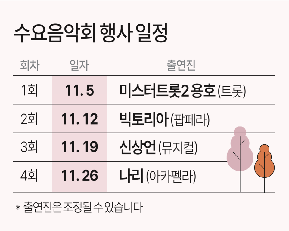 상반기 수요음악회에는 박성희 소프라노, 세계 합창올림픽 금메달 수상자인 쇼콰이어 그룹 하모나이즈 등 유명 가수들이 무대에 올랐다. 이번 가을 수요음악회에도 노란우산 홍보모델 출신 트로트 가수 김용호, 5인조 혼성 아카펠라 그룹 나린 등 높은 인기를 구가하고 있는 가수들이 뜨거운 무대를 선사할 예정이다.