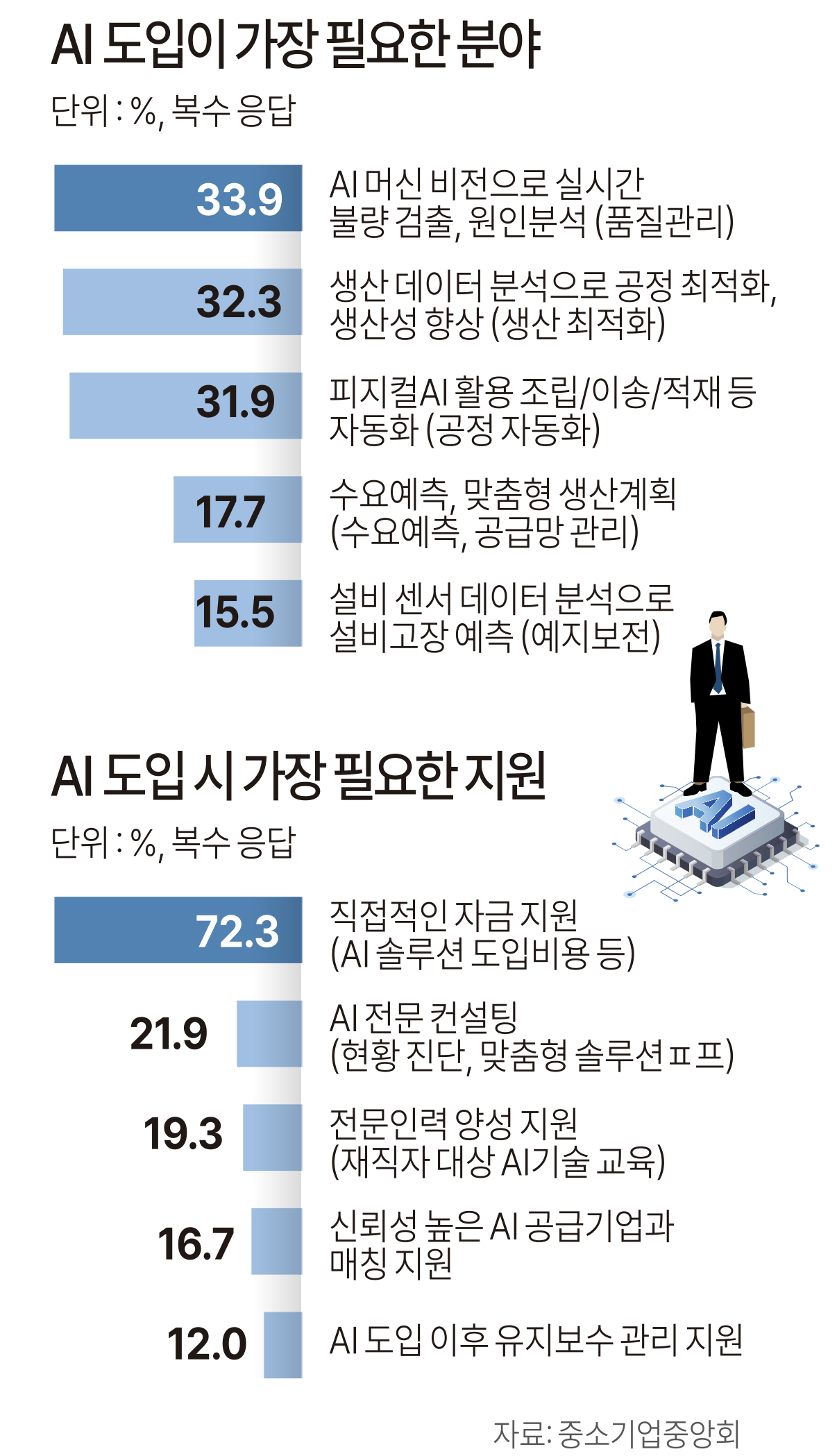 AI 도입이 필요한 분야로는 ‘품질관리’가 33.9%로 가장 많았다. 이어 △생산 최적화(32.3%) △공정 자동화(31.9%) △수요예측 및 공급망 관리(17.7%) 순으로 응답해 생산 효율 향상과 품질 개선에 대한 기업 수요가 큰 것으로 파악됐다.
