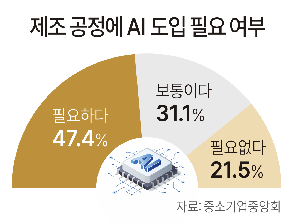 중소기업중앙회가 최근 5년간 스마트공장을 도입한 중소제조업체 502개사를 대상으로 실시한 ‘스마트공장 구축 중소기업의 AI 도입에 대한 의견조사’ 결과, 응답기업의 47.4%가 “제조 공정에 AI 도입이 필요하다”고 답했다. ‘보통’을 포함하면 AI 도입 필요성에 대한 인식이 78.5%로 매우 높은 수준이다.