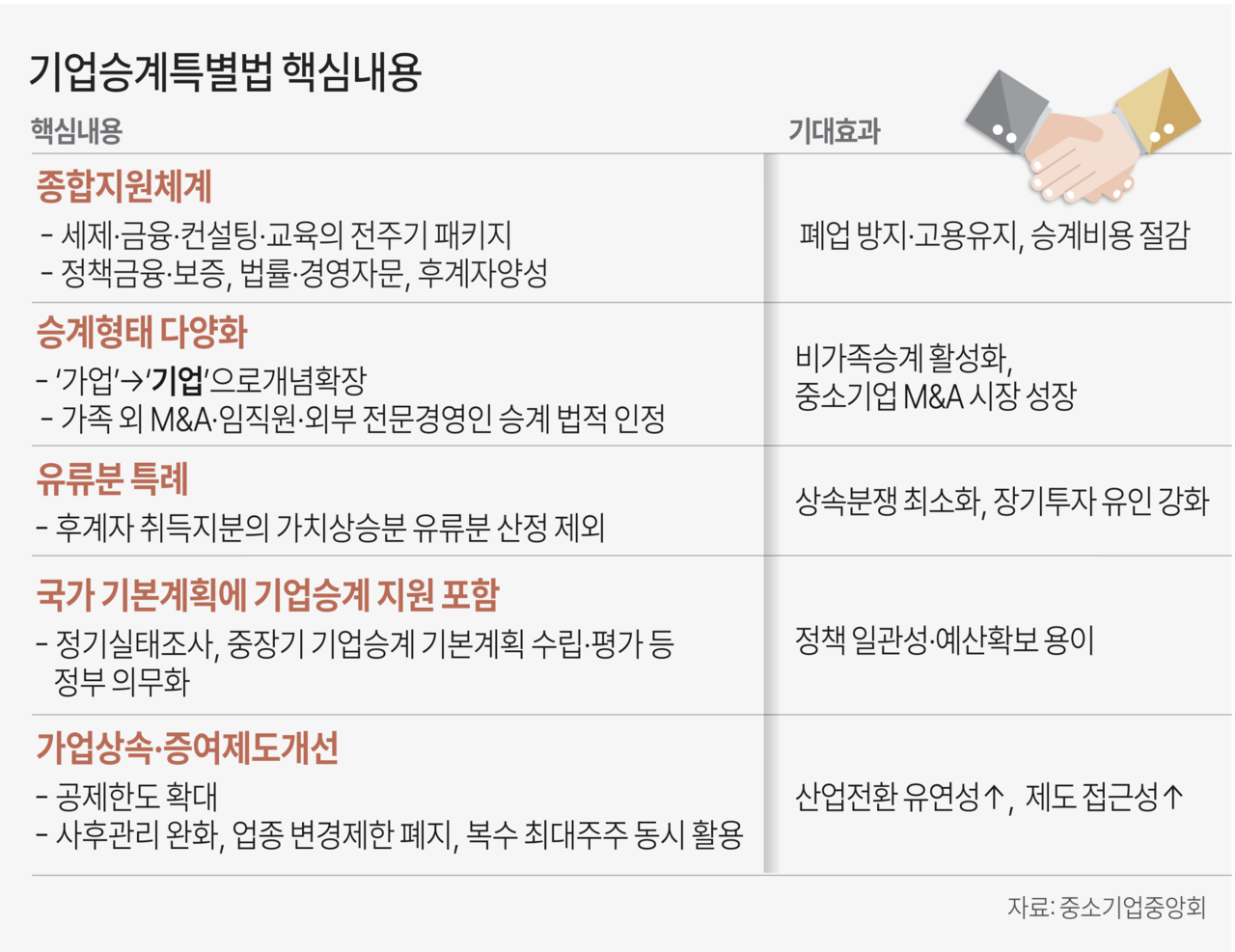 중소기업계가 제안한 ‘기업승계특별법’은 단순한 세제 완화가 아니라, 금융·보증·컨설팅·교육을 포괄하는 전주기 지원체계 구축을 골자로 한다. 핵심 내용은 △상속·증여세 완화 등 세제 감면 △후계자 양성 및 법률·경영 자문 지원 △M&A·임직원·전문경영인 승계의 법적 인정 △정부의 기본계획 수립 의무화 등이다.