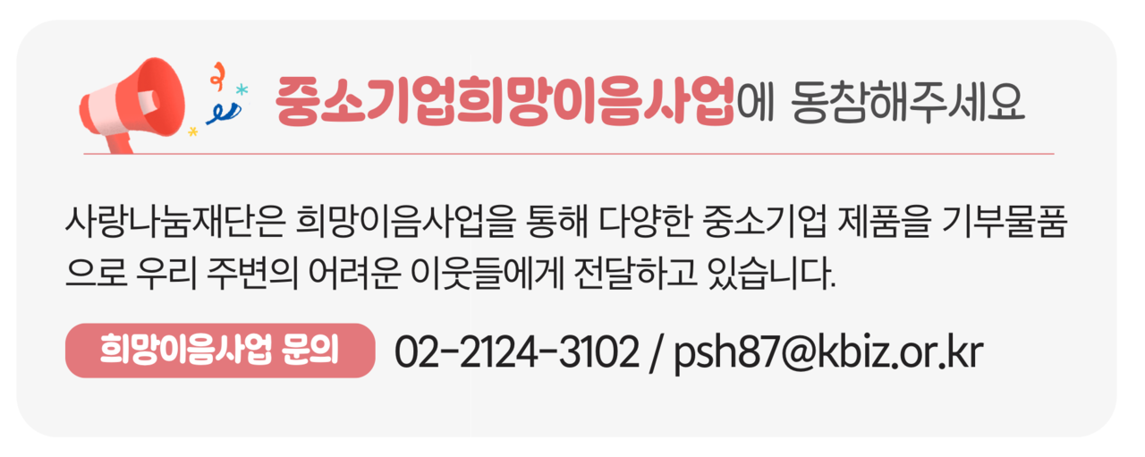 ‘희망이음사업’은 중소기업이 생산한 물품을 복지시설에 연결해주는 사회공헌 프로그램으로, 기업의 사회적 책임 실천과 지역사회 상생을 동시에 추구한다.