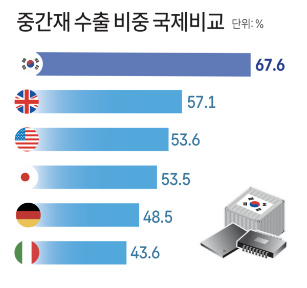 한국경영자총협회가 지난 9일 발표한 ‘우리나라 중간재 수출입 집중도 국제 비교와 시사점’ 보고서에 따르면, 지난해 한국의 수출액에서 중간재가 차지하는 비중은 67.6%로 집계됐다.